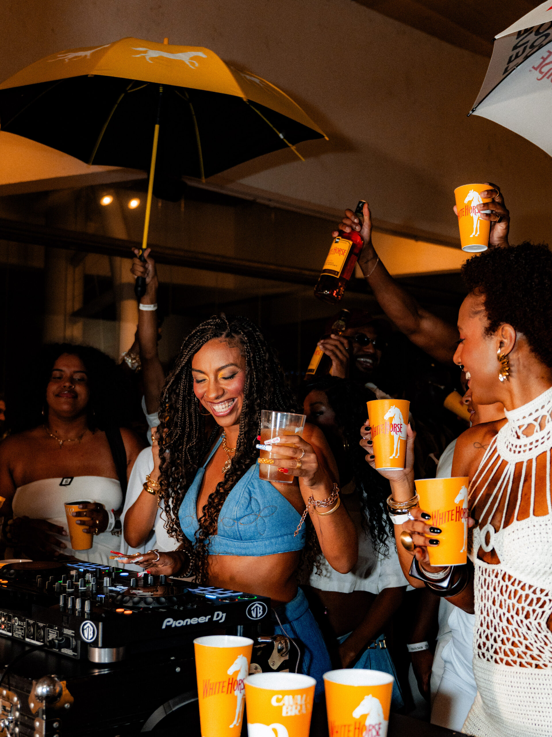 - White Horse & Coco Leve (“Na Mão do Rolê”): O grande destaque da tarde foi a collab entre o whisky White Horse e a Coco Leve. A festa serviu como palco orgânico para a nova campanha da AlmapBBDO, elevando o tradicional “Copão de Whisky” a um símbolo de pertencimento e status. A DJ Rayanne foi a protagonista visual da ação, exibindo unhas com nail art exclusiva da marca enquanto comandava o som. No carrinho bar personalizado, os convidados puderam provar, em primeira mão, o novo gelo sabor abacaxi da Coco Leve misturado ao White Horse.