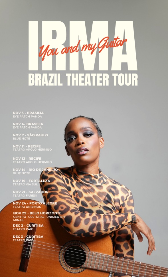 Irma se apresentará em Novembro e Dezembro, em Brasília, São Paulo, Recife, Rio de Janeiro, Fortaleza, Salvador, Porto Alegre, Belo Horizonte e Curitiba, com um formato minimalista e potente: apenas ela, o violão e uma stomp box, caixa de percussão que marca o ritmo de seus passos e pulsa como extensão do coração. Os shows compõe a nova fase da turnê “You and My Guitar”.