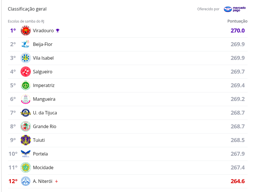 - Outras escolas como Mangueira e Salgueiro figuaram entre as mais bem pontuadas, evidenciando o alto nível técnico da competição neste ano.