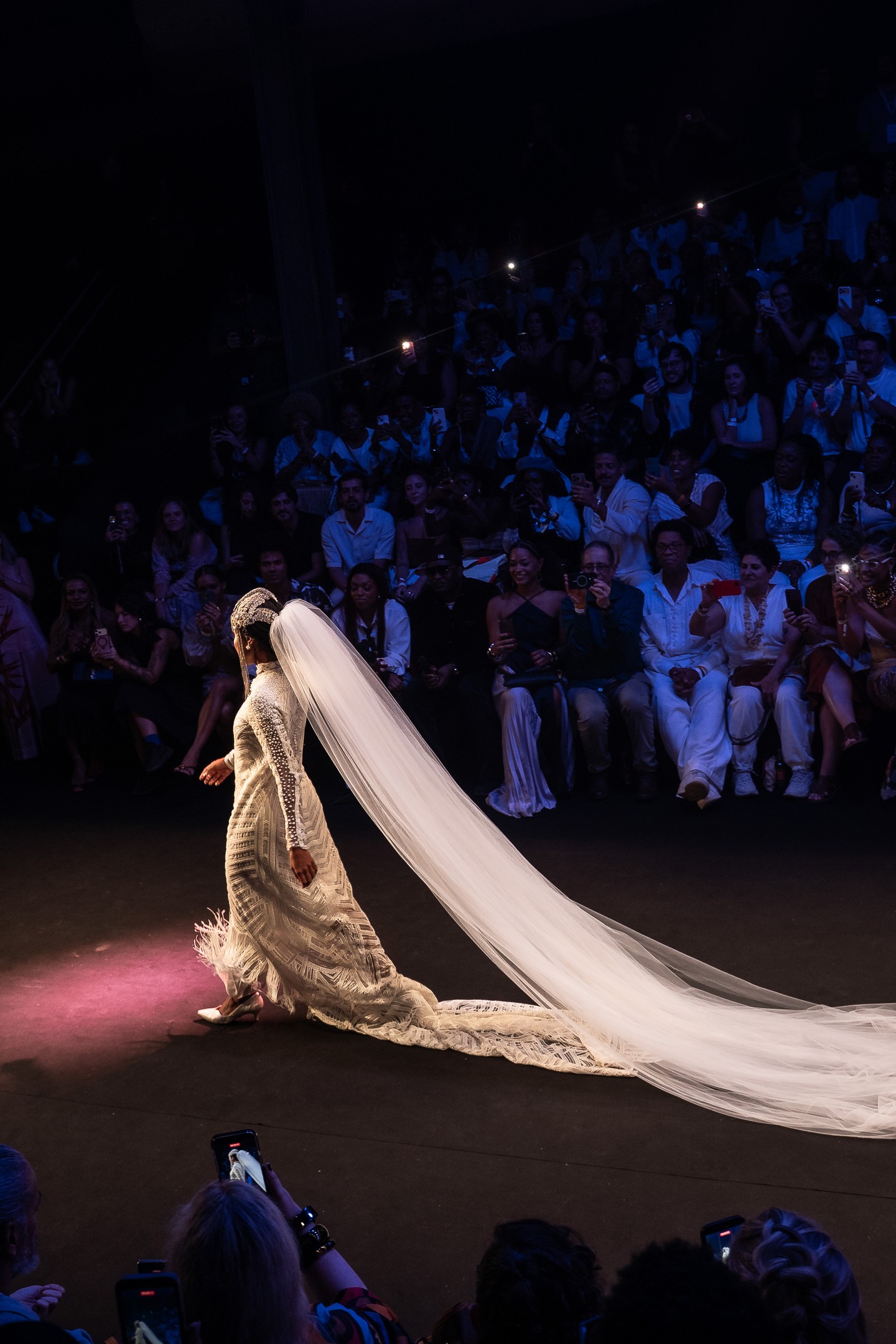 O encerramento ampliou o significado da apresentação ao homenagear nomes fundamentais da cultura negra brasileira. Elenco e modelos cruzaram a passarela com estandartes que traziam figuras como Abdias do Nascimento, Conceição Evaristo, Carolina Maria de Jesus, Ruth de Souza e Milton Santos, transformando o desfile em um gesto de memória e reconhecimento.