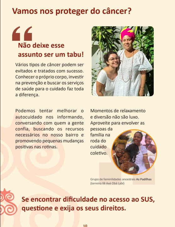 “Os terreiros são locais de acolhimento, cuidado e solidariedade, espaços de cultura e de religiosidade afro-brasileira. Aproximar esse universo dos saberes técnicos pode nos ajudar a prevenir doenças, como o câncer, e foi o diálogo proposto na cartilha.”