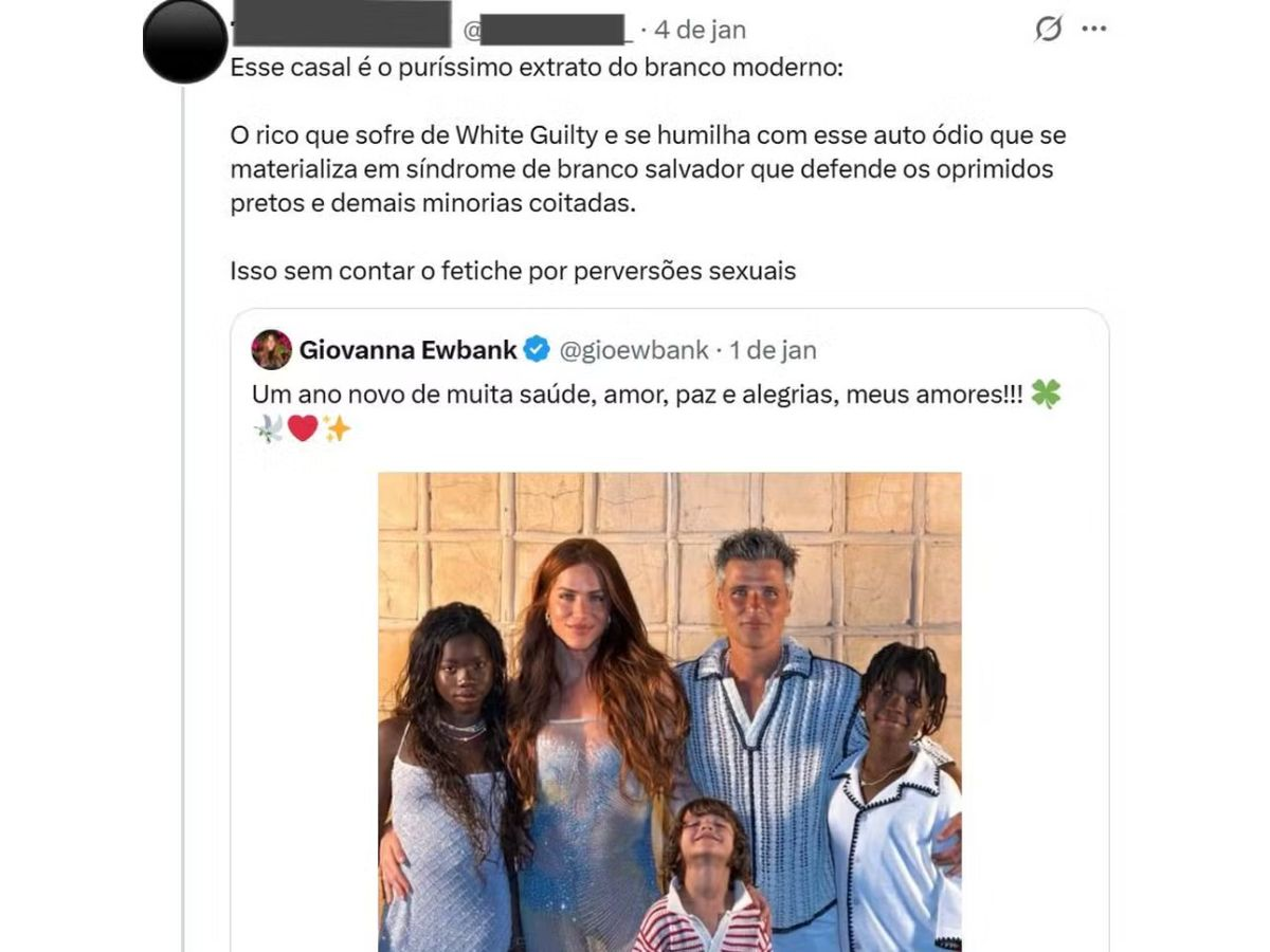 Giovanna Ewbank usou as redes sociais para reagir a um comentário ofensivo direcionado à sua família e afirmou que vai tomar medidas judiciais contra o autor da mensagem. O episódio aconteceu após a apresentadora publicar uma foto com o marido, Bruno Gagliasso, e os filhos para celebrar a virada do ano.